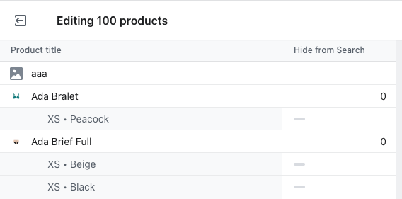 Load the Bulk Editor from the link, then change the value of ‘Hidden’ to 0 for each product you want to hide from your Shopify site search. Be sure to click the Save button once you’re done