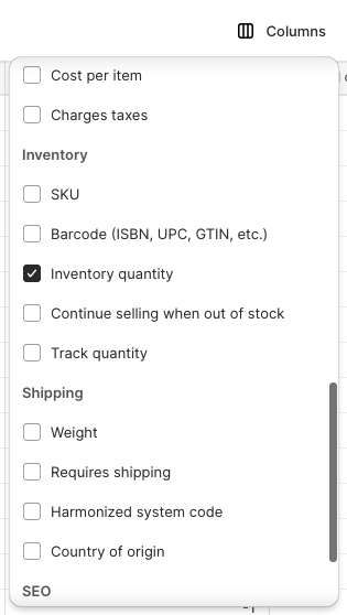 Click Columns, scroll down to the Inventory section, and click the ‘Track quantity’ checkbox.