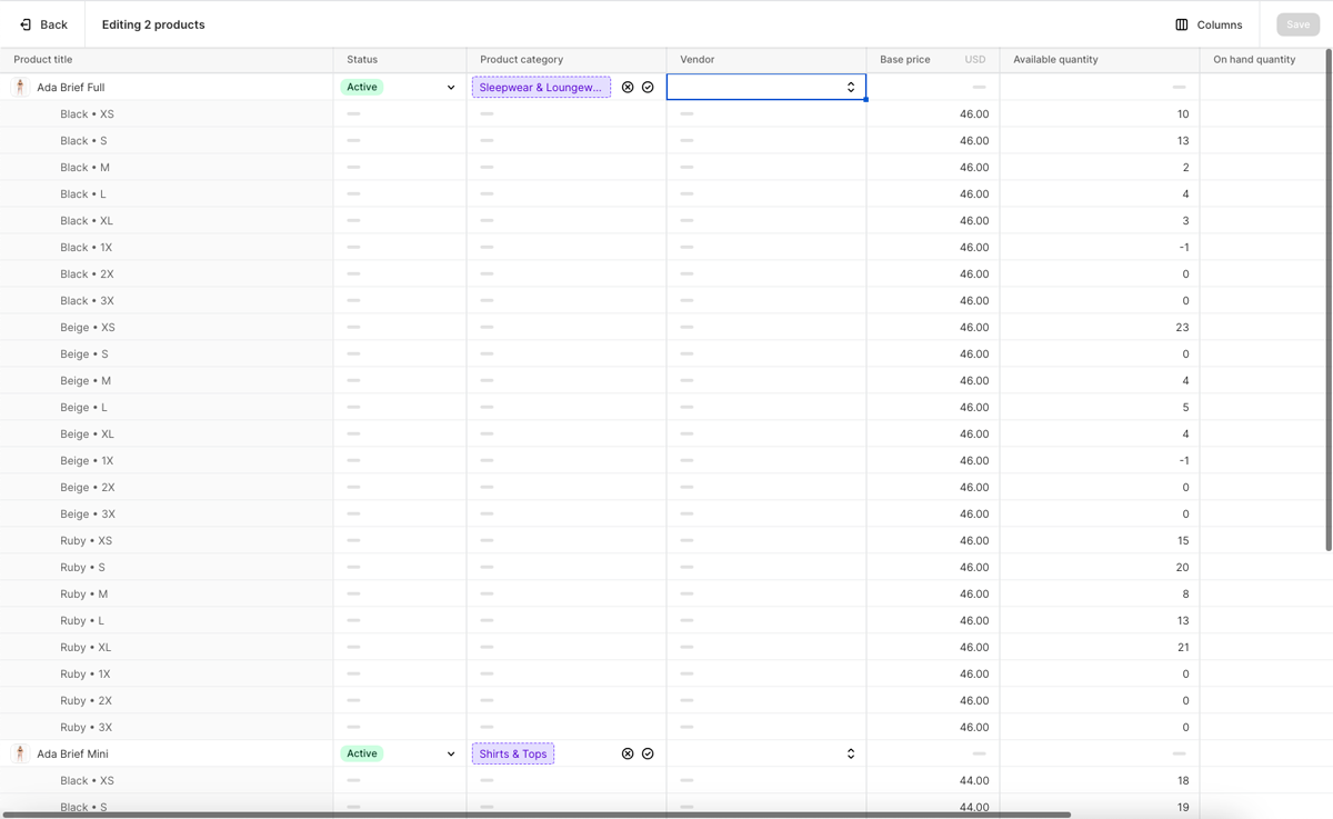 The Bulk Edit screen resembles a spreadsheet and allows you to change most things about your products